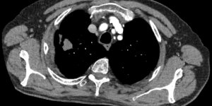 Lump over Medial clavicular region close to SCJ 57 female Reports slow growing lump in chest region for over 5 years. No trauma. Gets some shoulder pain. Has been having osteopathy for shoulder. Full shoulder ROM on examination. Non tender lump. Mild SCJ tenderness. Clinician requested MRI scans. Retrospective and current investigations below. [...] Read more